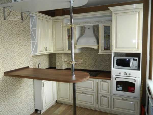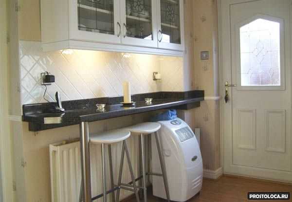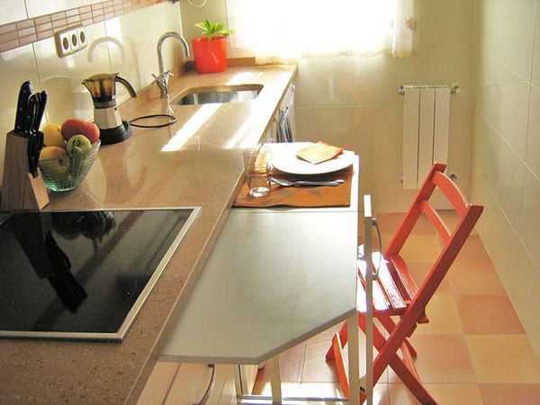 Второй вариант подойдет даже для микрокухонь. Он представляет собой выдвигающуюся из гарнитура дощечку. У нее нет ножек, она не вынимается полностью и число принимающих за ней пищу обычно ограничивается двумя людьми. Однако при тотальной нехватке места на кухне и скромном количестве членов семьи это прекрасный вариант.