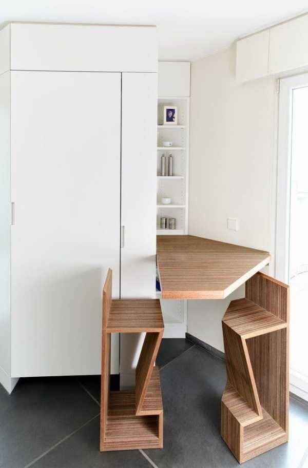 А этой бесполезной нише находчивые дизайнеры тоже нашли свое применение, придумав интересный обеденный уголок. В открытом варианте это откидной геометричный столик с креативными стульчиками…