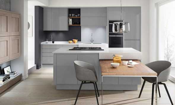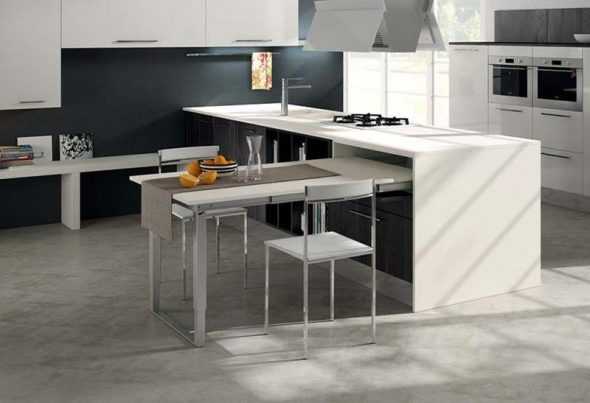 Выдвижной стол из кухонного острова на кухне в стиле минимализм
