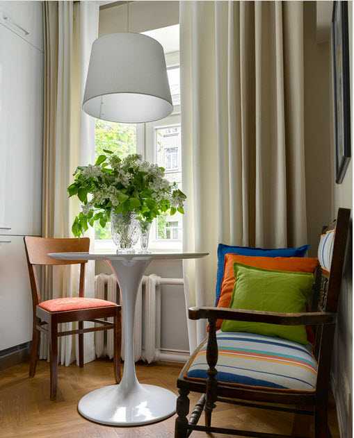 Именно возле окна многие дизайнеры рекомендуют поставить маленький раскладной кухонный стол. Но расстояние между мебелью и столом должно быть не менее 1 метра, в противном случае, за ним будет просто неудобно сидеть. Если человек, сидящий на этом месте тучный, расстояние даже можно увеличить.