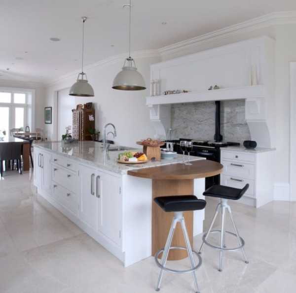 Часто форма стола зависит от дизайна кухни, как в этих проектах на фото. Концепция плавных линий и полукругов здесь прослеживается практически во всем.