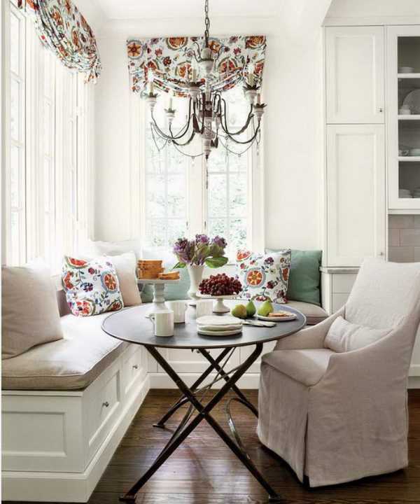 Кухня в деревенском стиле: обилие света, деревянная мебель и дверь с окном-сердцем, текстильное оформление высоких стульев и множество милых интерьерных мелочей. Маленький стол с подпоркой – модификация компактного обеденного места