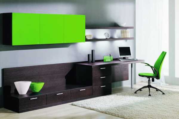 Рабочая зона с компьютерным столом в ярко-зеленом цвете в интерьере гостинойКомпьютерный стол как продолжение мебели в гостиной