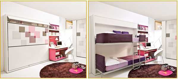 Существует несколько вариантов конструкции подобных моделей, помните желтую кровать на самом первой фотографии? Ее механизм передвигает рабочий стол не вниз, а наверх. А так она выглядит после трансформации, оживляя интерьер насыщенным розовым.
