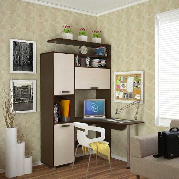 Такой вариант мебели идеально подходит для небольших гостиных, где необходимо сохранить побольше свободного места. Хоть мебель занимает и мало места, но есть возможность разместить все необходимые документы и технику для работы.