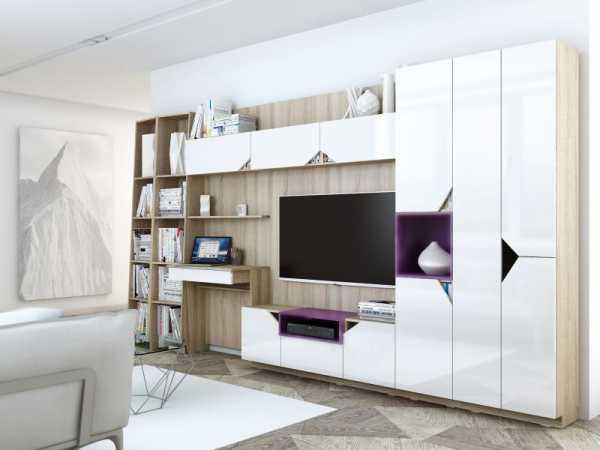 Стенка в гостиную с компьютерным столом бывает цельной или состоящей из отдельных элементов (модулей).