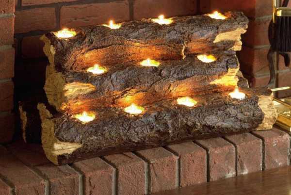 Одиннадцатый способ — имитация камина с помощью чайных свечей. Для этого нам понадобится полено или несколько, в котором мы выпилим углубления а затем поставим туда наши свечи: