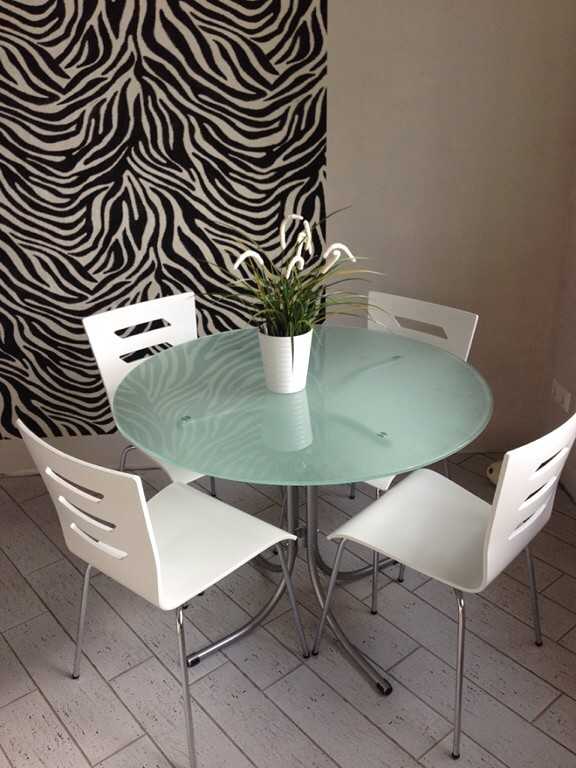 Кроме того, круглый стеклянный стол на кухню можно не накрывать, а просто использовать специальные подставки под тарелки. А вот если вы захотите поставить круглый белый стол на кухню, то за ним пройдется хорошо ухаживать, так как жирные пятна будут видны на таком столе.