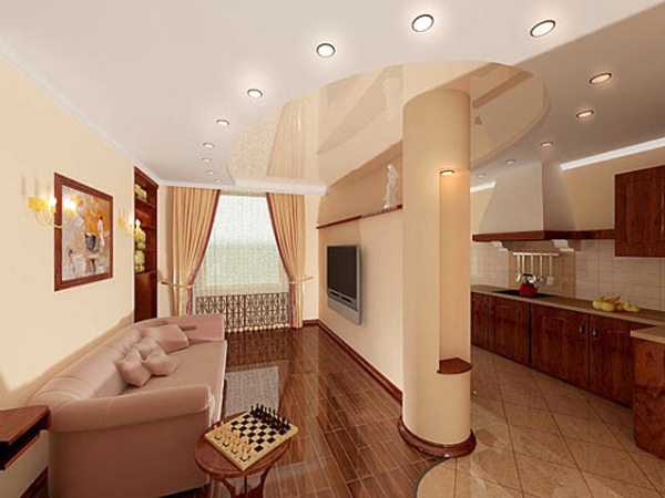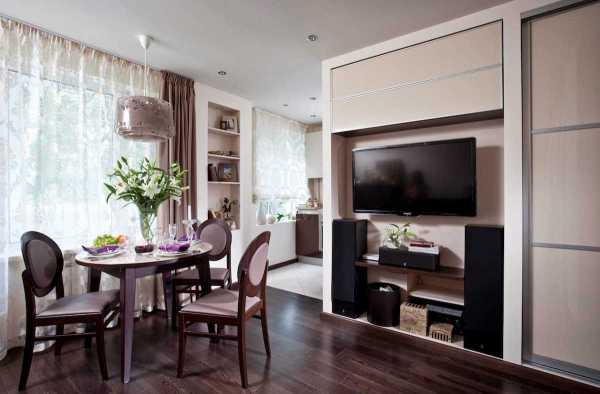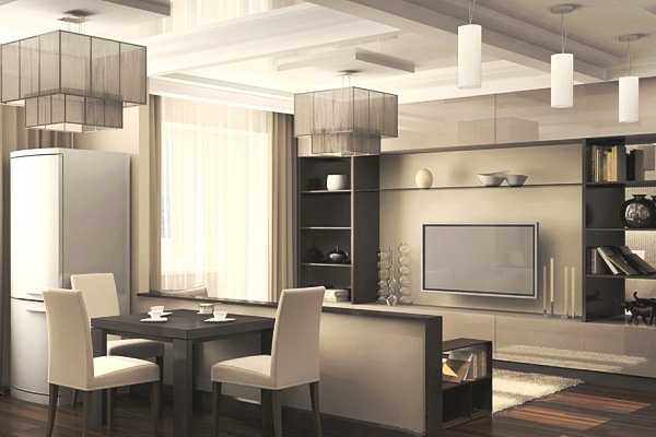 Зона кухни со столовой — это малозаметная область, предназначенная для приготовления пищи. Но много место выделяется под удобный диван, стенку с телевизором, столик будет установлен маленький или такой, чтобы можно было раскладывать и складывать.