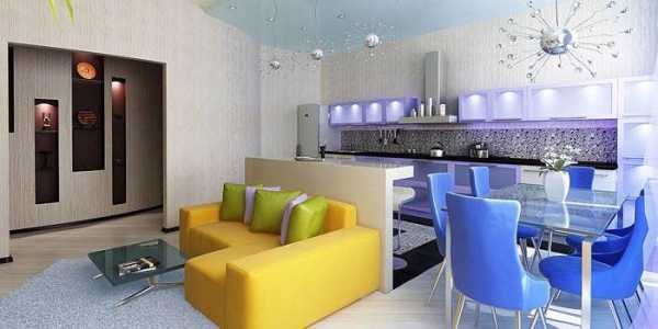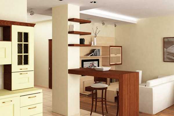 - При зонировании желательно использовать не только разные оттенки стен или пола, но и подходящую мебель (например, небольшой стеллаж, шкаф или барную стойку).