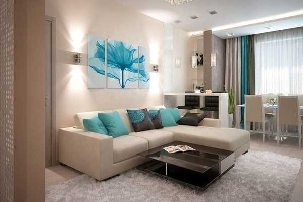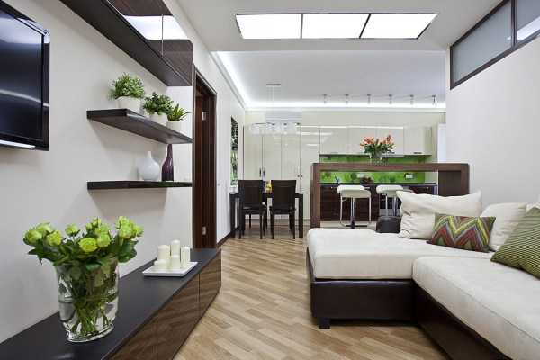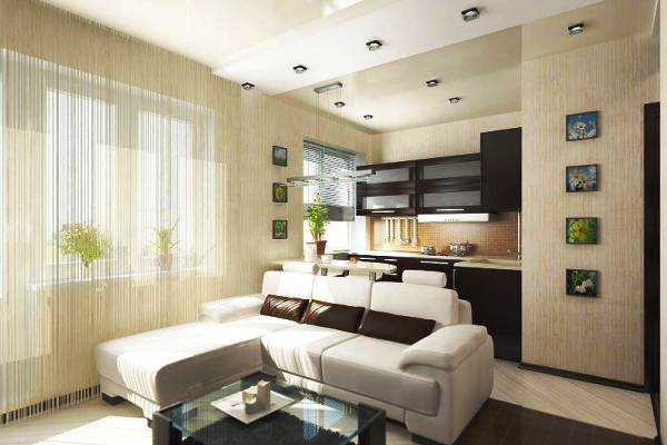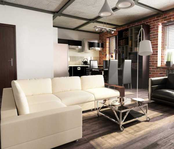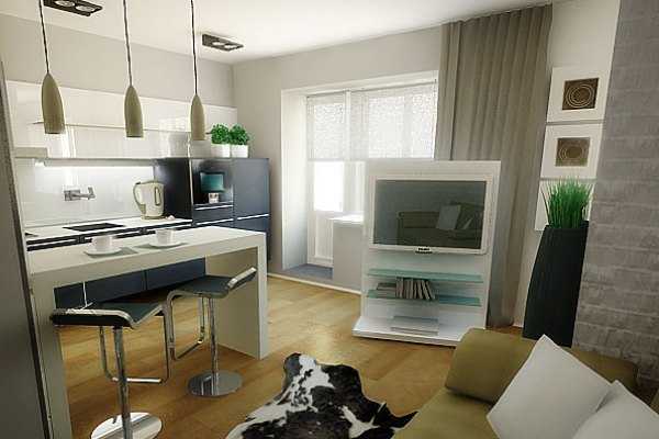 Студия-гостиная. Такой вариант встречается чаще и предполагает экономию места за счет кухни, развертывание на остальной территории места для отдыха и встречи гостей. Зона готовки оформляется максимально компактно и скромно, обычно в нейтральной расцветке. Дизайн зала в принципе не отличается от гостиной в обычной квартире, однако его необходимо будет оградить от кухни, используя специальные приемы зонирования.