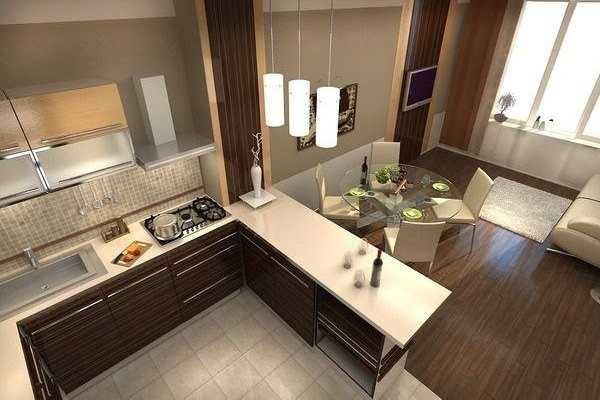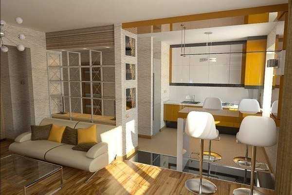 | Всё находится очень близко: и диван, и кухня, и рабочая зона, всё под рукой. Если есть маленькие дети, за ними легко следить, находясь на кухне. | Необходимость в хорошей вытяжке, так как все возможные запахи будут находиться здесь же, в комнате. |