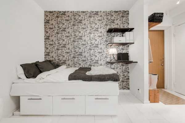 - Для образования дополнительной системы хранения часто основание кровати поднимается, и внизу располагаются вместительные ящики. Интерьер квартиры студии 20 кв. м должен быть продуман.
