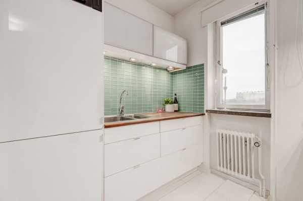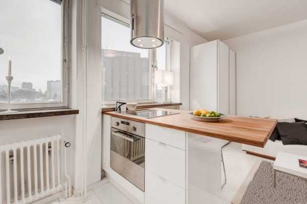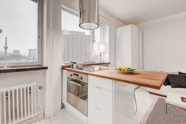 Кухонная зона займет почти всю одну стену – мойка, духовка, варочная панель, стиральная машина, вытяжка, холодильник. Вся техника приобретается узкая, малогабаритная, встраиваемая. Пространство для готовки и принятия пищи разделяют барной стойкой. Кухонную утварь, посудные принадлежности хранят в высоком шкафу-пенале, мини-диванчике, со встроенными секциями. Важно установить на кухне мощную вытяжку, чтобы запахи не распространялись. Столовую зону легко разместить на лоджии или утепленном балконе – тогда столешница монтируется туда, где было балконное окно с дверью.