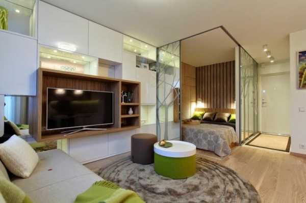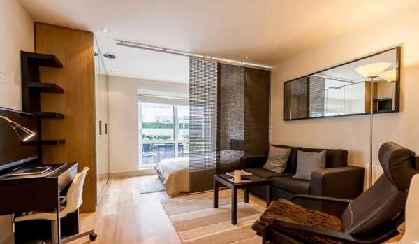 Для того чтобы на небольшом пространстве квартиры-студии была создана гармоничная и комфортная обстановка, дизайнеры используют множество хитростей. Помимо открытой планировки, максимального освещения пространства, применения зеркального потолка и стеклянных панно, интересным решением является использование мобильных перегородок со стеклянными либо зеркальными поверхностями.
