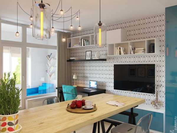 Благодаря активной бирюзе пространство не кажется скучным, а что касается белого, то он не даёт визуально «съесть» драгоценное пространство. Получается полная гармония. Но и такое сочетание не было бы полноценным, если бы в него не добавили немного тёмных и бежевых вкраплений.