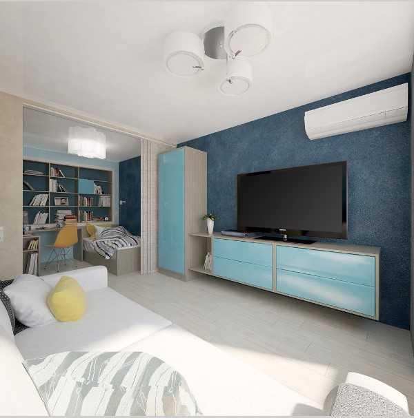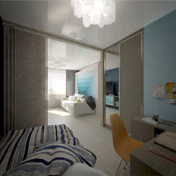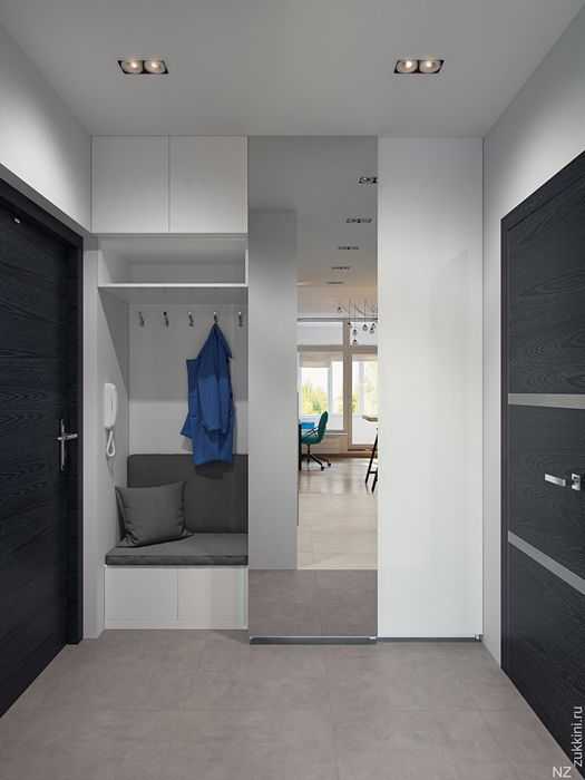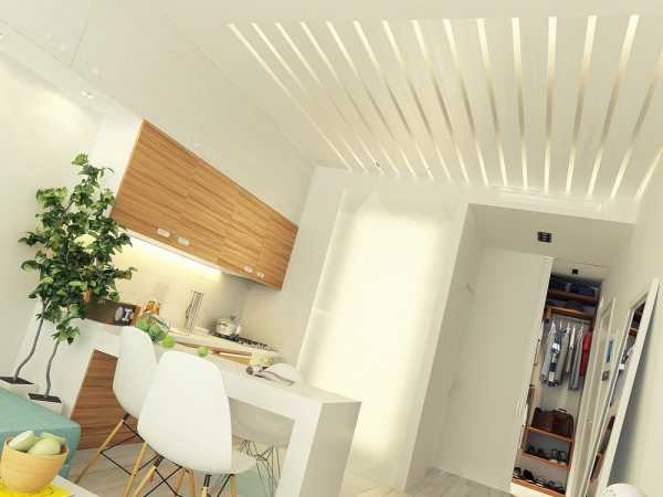 Сквозной стеллаж с полками отгородит зону отдыха от рабочего пространства. Стол, имитирующий барную стойку, минимизирует расход квадратуры и отделит обеденный участок. Двери-гармошки и шторы скроют место входа в квартиру, внеся аккуратность в окружающее пространство.