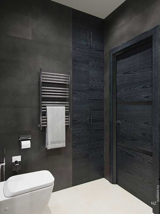 Если вся квартира оформлена в ярких и свежих тонах, то в санузле дела обстоят иначе. Тут царит атмосфера полного спокойствия и умиротворения. Добиться такого эффекта удалось благодаря тёмной отделке, и контрастному сочетанию чёрного и белого. Именно поэтому санузел смотрится очень солидно и по-мужски.