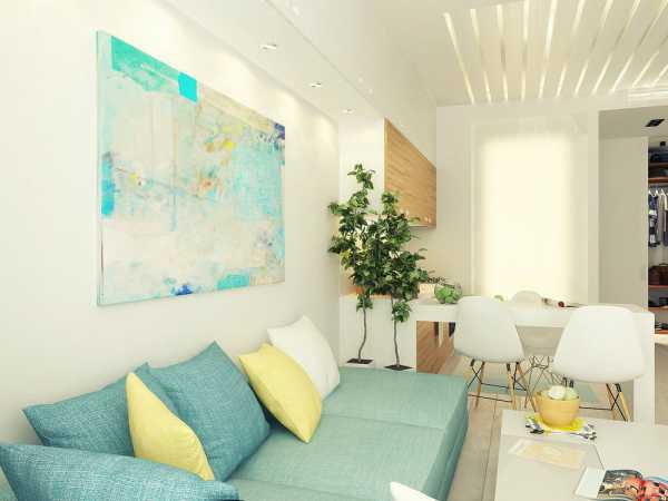 Дизайн квартиры 29 кв. м. выполнен в белом цвете. Яркими акцентами служат бело-голубая картина в жилой зоне зеленовато-голубой диван. Дополнительные акценты — цвет дерева в отделке кухни. В интерьере маленькой студии использован также яркий желтый — в диванных подушках и в отделке санузла.