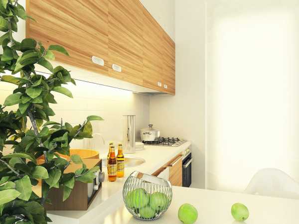 Далее по ходу следования дизайн квартиры 29 кв. м. предполагает кухонную зону. Гарнитур небольшой, стандартный, отделка — дерево. Вместо обеденного стола — барная стойка, которая в интерьере маленькой студии одновременно выполняет роль перегородки между кухонной и жилой зонами.