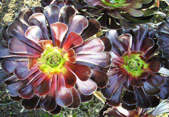 - Эониум Шварцкопф. У эониума Шварцкопф темно-бордовые листья, они почти черные и светло-салатовые у основания.