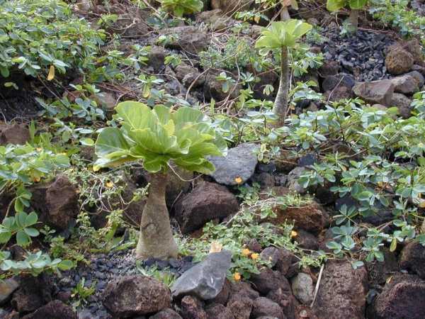 - Эониум канарский. Эониум канарский вырастает в виде 30 сантиметрового куста, он имеет широкий ствол и коротенькие ветви. У него светло-салатовые листья и кремовые цветы. В дикой природе он растет на островах Тенерифе.