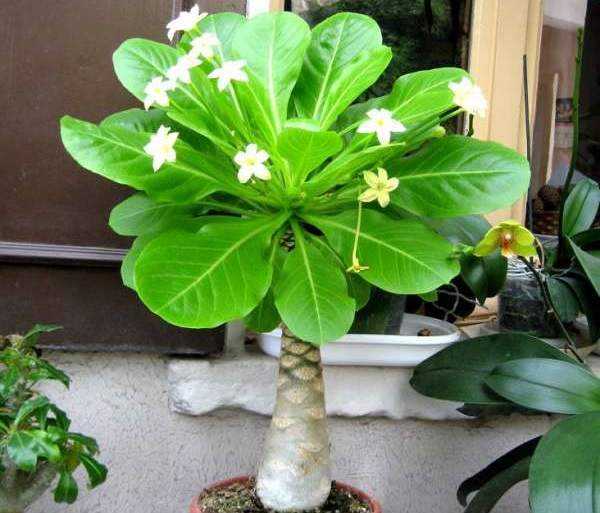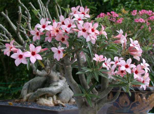 Удивительно красивое растение, которое называют роза пустыни. В культуре известно около 50 видов адениумов. В домашних условиях выращивают чаще всего адениум тучный. Экземпляры, выращенные из семян, с возрастом наращивают причудливый каудекс (утолщение в нижней части стебля), благодаря которому адениумы приобретают декоративный вид. При выращивании растений из стеблевых черенков каудекс не образуется. Можно размножать разновидности адениума прививкой.