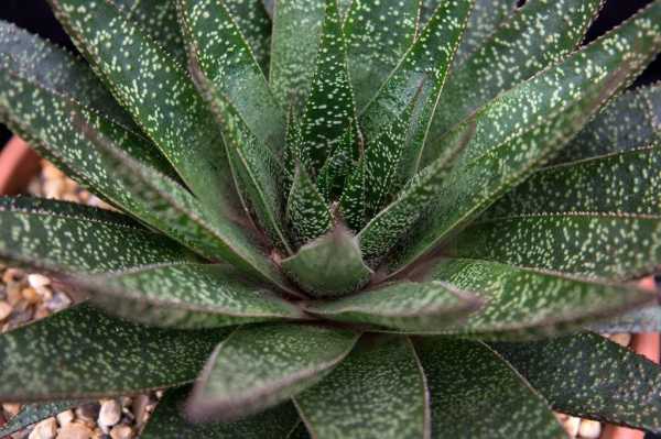 - Гастерия — жесткие листья с белыми пятнами располагаются двурядно на сильно укороченном стебле.