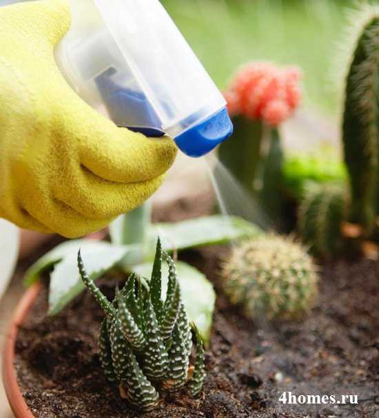 При выращивании суккулентов лучше пересушить растения, чем перелить. Режим полива для летнего времени устанавливается примерно 2 раза в неделю. Зимой некоторые растения можно не поливать совсем (пустынные кактусы) или провести 2 полива за сезон покоя. Вода для полива должна быть комнатной температуры или чуть теплее, хорошо отстоянной.