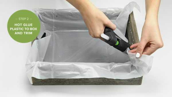 Пройдитесь горячим клеем по всем четырем стенкам рамки и приклейте пленку. Будьте осторожны, клей может быть горячим для голых пальцев. Как только пленка закреплена, удалите ножницами излишки.