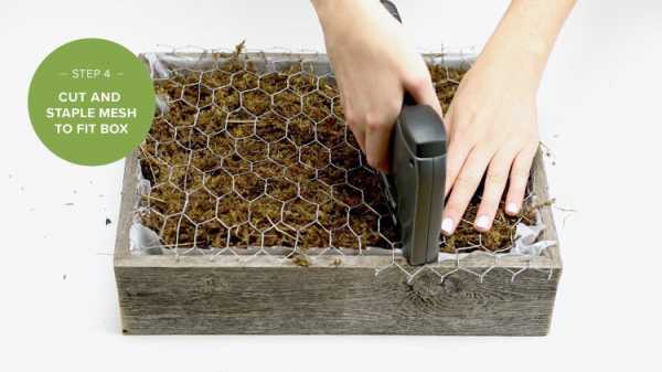 Важно сделать так, чтобы всё содержимое рамки (мох и почва) было уплотнено и оказалось вровень с сеткой. Поэтому сразу после посадки растений придётся добавить мох, кокосовое волокно или кусочки поролона.