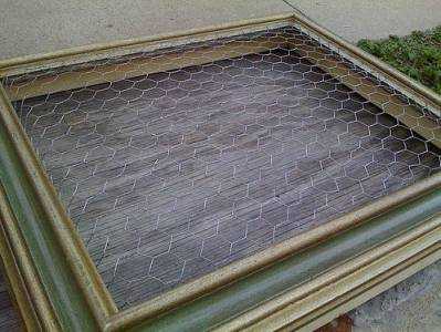 Уложите декоративную раму лицевой стороной вниз, уложите сетку-рабицу, срежьте излишки сетки ножницами по металлу (обязательно оденьте перчатки!)