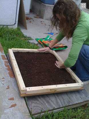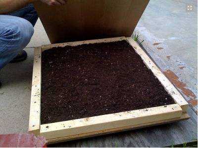 - Раму укладывают горизонтально на стол и заполняют через ячейки сети грунтом. Не забывайте утрамбовывать, используя для этого карандаш.
