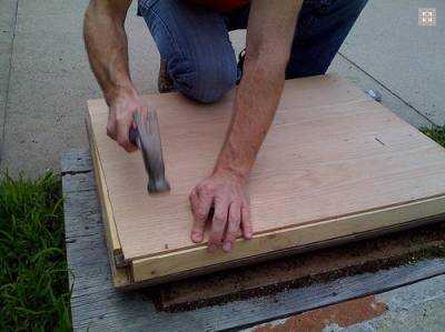Прибейте фанеру к раме. Чтобы земля не выпала под переднюю часть рамы положите еще один лист фанеры.