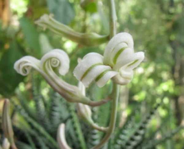 Цветет ночью, у многих видов мелкие звездчатые цветочки на длинном цветоносе издают сильный аромат гвоздики либо ванили. Досадная особенность растения – после цветения розетка больше не образует новой листвы.
