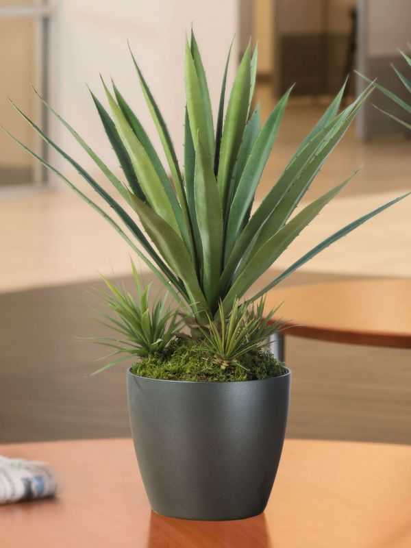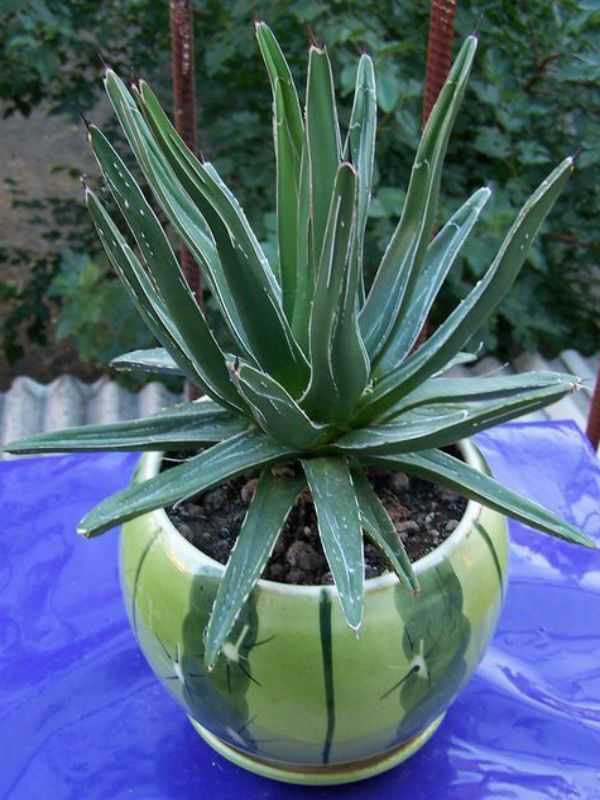 | Агава американская | Листовой многолетник, надземная часть которого представлена прикорневыми, зелено-пестрыми или однотонно-зелеными, толстыми, с сужением в верхней части, твердыми, линейно-ланцетными листьями, располагаемыми по кругу и с мелкими шипами на краях | Невзрачного внешнего вида, зеленовато-желтые цветки с высокой цветоножкой | Выращивание в специальном лиственно-дерново-песчаном грунте при температурном режиме не ниже 8оС |