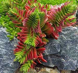 При создании садовых композиций достаточно часто используются суккулентные растения из семейства толстянковых, представленные крассулой, аихризоном или «деревом любви», очитками, каланхоэ, эхеверией или «каменной розой», эонумом или «вечно живущим растением». Многие известные ландшафтные дизайнеры рекомендуют использовать для садового оформления разные виды молодила и седума, которые отличаются не только формой, но и окрашиванием надземной части. Разновидности молочая очень часто используются в качестве почвопокровных декоративных садовых растений. Интересную многоярусную декоративную композицию можно создать из ползучих очитков, которые также считаются идеально подходящими для озеленения кровли.
