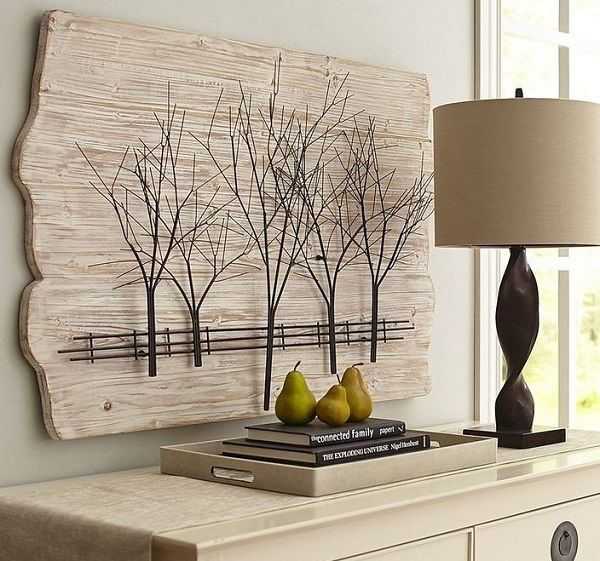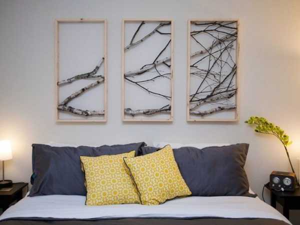 Интересным решением, которое позволит избежать траты средств на фотообои, являются картины из веток. Например, ветки березы в интерьере выглядят очень изящно и так по-русски.С помощью обрезков ивы можно создавать легкие ажурные композиции. Для этого достаточно сделать деревянную рамку и прикрепить с помощью саморезов или степлера подобранные по размеру ветви.