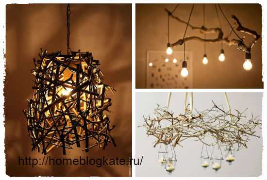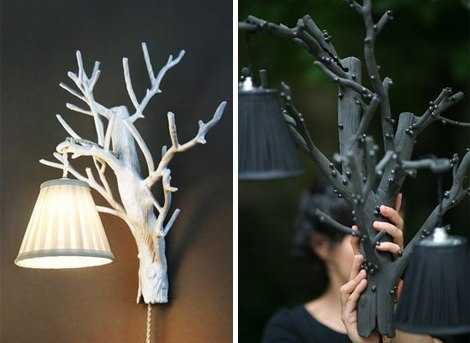 Много различных идей существует для создания осветительных приборов. Очень красиво выглядят светильники, в которых ветки разного диаметра применяются как основание.