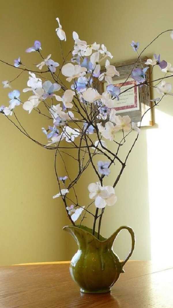 Создать такую композицию под силу каждому. Всё, что тебе потребуется, — охапка тонких сухих веток, керамическая емкость, несколько нежных искусственных цветов, клеевой пистолет и 15 минут свободного времени. Работа несложная, а атмосфера в доме изменится кардинально.