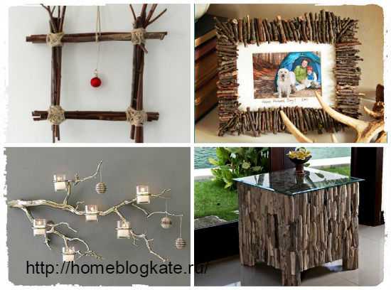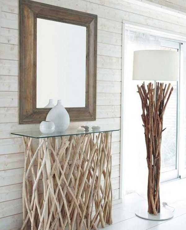 Ветки в интерьере могут найти свое место и в качестве комплектующих оригинальной мебели, ножек, подставок, держателей или рамок к зеркалу.