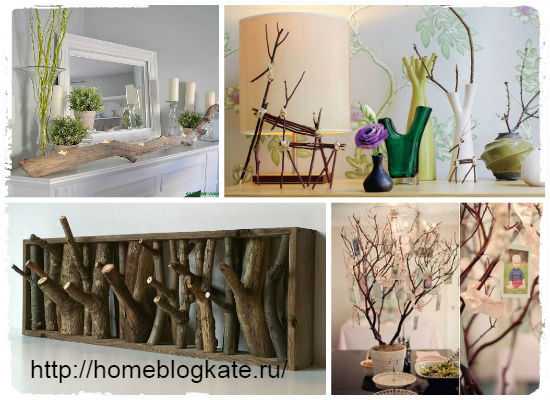 Ветки в интерьере могут использоваться и в качестве комплектующих оригинальной мебели, ножек, подставок, держателей или рамок зеркал.