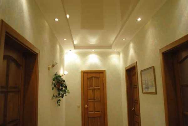 Многоуровневый натяжной потолок со световой дорожкойЕсли в коридоре глянцевый натяжной потолок, то в качестве дополнительного освещения хорошо смотрятся направленные вверх софиты. Их лучи, отраженные в потолке создадут интересную игру света.