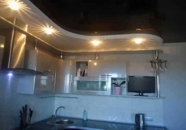 Освещение кухни без подвесной люстрыНиже представлен еще один вариант «безлюстровой» схемы для кухни с потолочным полотном.