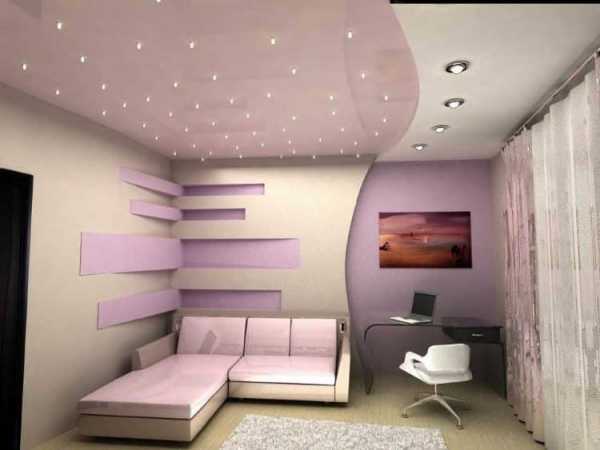 Как правило, такие комнаты зонируют на место для сна, учебы и игровую площадку. Соответственно, над столом следует установить на натяжной потолок группу дополнительных светильников, а возле кроваток поместить бра.