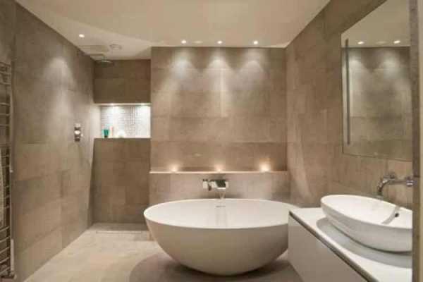 Равномерно расположенные светильники в ваннойСвет может подчеркнуть зонирование.
