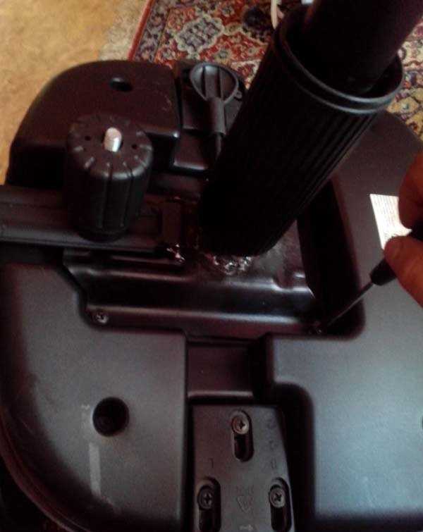 Для начала удалите опору, избавившись от винтов. С помощью опоры можно регулировать высоту кресла. Перед тем, как заменить опору, снимите сидение.
