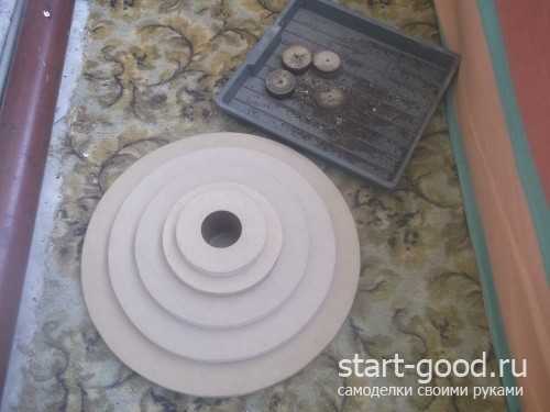 Для новой крестовины(точнее уже не крестовины) были выпилены 5 кругов разного диаметра из МДФ, также можно использовать фанеру или ДСП.