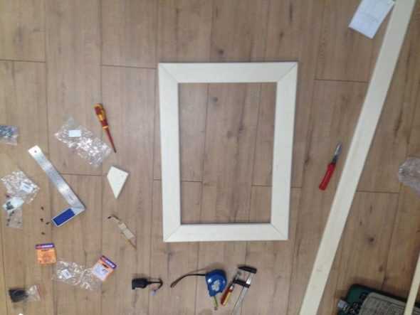 Из заготовок размером 120 х 15 делаем аналогичным способом вторую раму, внутренний периметр у которой должен быть на 10 см. меньше высоты и ширины стекла. Эти поля предназначены для вклейки зеркала. На наружный торец крепим конфирматами брусок 20 х 40 так, чтобы получились бортики высотой 25 мм. Теперь соединяем две части с помощью саморезов 3,9 х 51 с задней стороны. Для заполнения внутренней щели применим брус 20 х 25, предварительно прикрепив его к фасаду на уголках. Изделие после сборки должно иметь вид короба с крыльями 10 мм. на наружном периметре наличника и 50 мм. внутренней части.