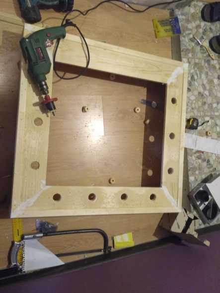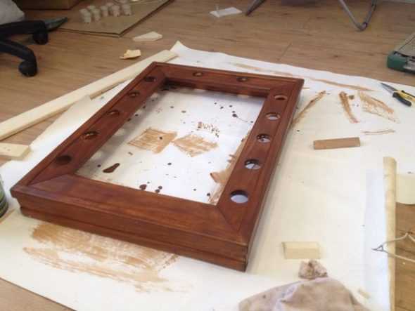 Собираем раму с помощью мебельных плоских уголков на внутреннем крае и евровинтов снизу и сверху внешнего края. Отверстия для евровинта сверлим диаметром 4,5 мм. и зенкуем под головку 6 мм. Должна получиться аккуратная рамка для зеркала без щелей и зубов на углах элементов, с круглыми прорезями по контуру.